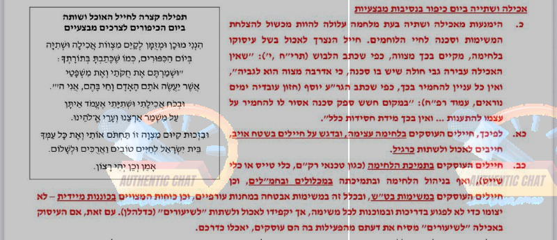 - ״הימנעות מאכילה ושתייה בעת מלחמה עלולה להוות מכשול להצלחת המשימות וסכנה לחיי הלוחמים. חייל הנצרך לאכול בשל עיסוקו בלחימה, מקיים בכך מצווה. חיילים העוסקים בלחימה עצימה, ובדגש על חיילים בשטח אויב, חייבים לאכול ולשתות כרגיל. חיילים העוסקים בתמיכת הלחימה ואף בניהול הלחימה ותמיכתה במכלולים ובחמ״לים, וכן חיילים העוסקים במשימות בט״ש, ובכלל זה במשימות אבטחה במחנות עורפיים, וכן כוחות המצויים בכוננות מיידית, לא יצומו״. דורון קדוש