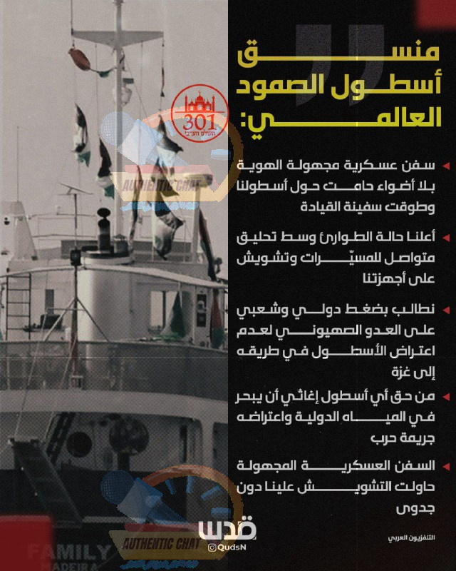 - ממארגני המשט נמסר הלילה: -ספינות צבאיות לא מזוהות ללא אורות סובבו סביב הצי שלנו והקיפו את ספינת הפיקוד. -הכרזנו על מצב חירום בעקבות טיסות בלתי פוסקות של רחפנים מעלינו והפרעות למכ״מים שלנו. - אנו דורשים לחץ בינלאומי ועממי על ישראל לא להפריע לצי בדרכו לעזה. - לכל צי סיוע יש זכות לשוט במים בינלאומיים והפרעה לו היא פשע מלחמה. - הספינות הצבאיות הלא מזוהות ניסו להפריע לנו ללא הצלחה. הפעילות הישראלית כנגד המשט הזה קרובה מתמיד, לכוחותינו שלום.